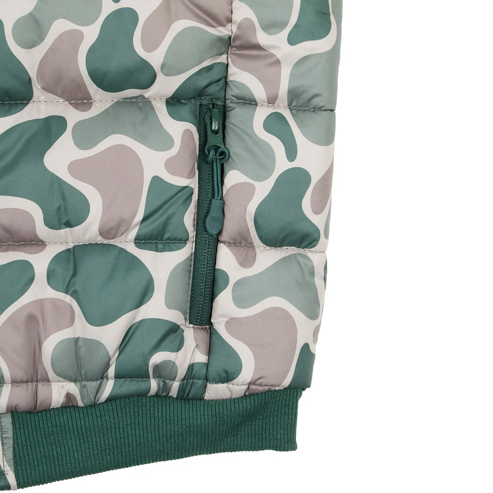 The Camo Roost Puffer Vest from Fieldstone combines rugged outdoor style with lightweight warmth. Designed with an allover camo print, this versatile vest layers easily over shirts or jackets for comfort in cooler weather. The insulated construction provides warmth without bulk, while the water-resistant fabric helps protect against light outdoor conditions. Finished with a ribbed hem and arm openings for a secure fit, this vest is perfect for school, casual wear, or outdoor adventures.