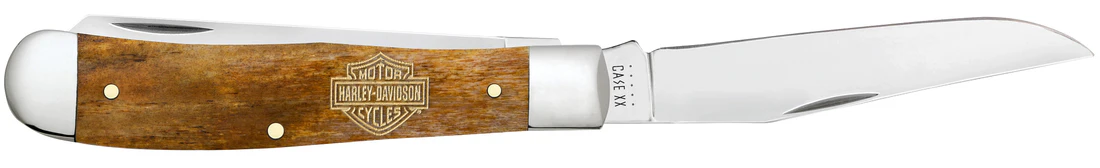Give your showroom an extra edge with the 2025 Harley-Davidson Starting Lineup. Featuring Case’s classic Trapper, versatile Canoe, these popular styles appeal to a variety of Harley-Davidson owners and keep your display sharp with their head-turning designs. The Trapper gets its name from the consumer it was designed for. Because of its basic trapping and skinning blades and its light weight, it is a must-have knife for those who trap small game. It is a jack knife with two full length blades; a slender Clip and a long Spey. The Clip blade is commonly used as a multi-purpose blade and preferred for detail work while the Spey blade is commonly used as an all-purpose utility blade. This knife is constructed with Case Tru-Sharp stainless steel which is a special high-carbon steel that helps the blades hold an edge longer than conventional steel. It also offers extraordinary blade strength and corrosion resistance. Comes conveniently packaged in a box. Made in Bradford, PA, USA from domestic and imported materials.