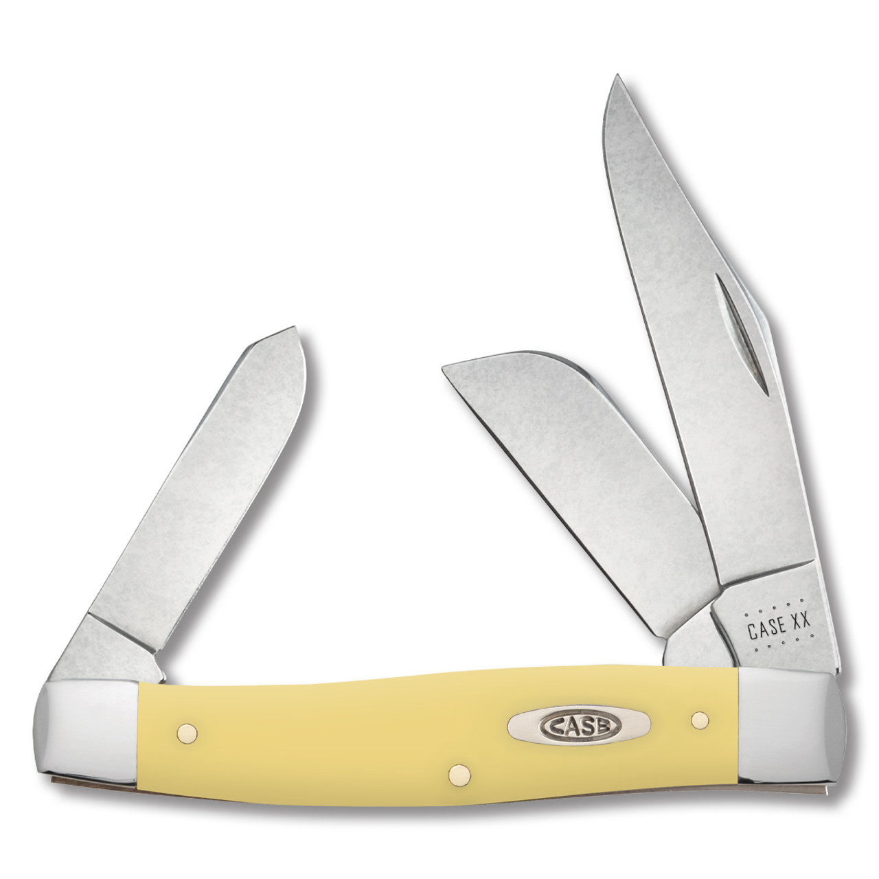 This Large Stockman is a part of the Yellow Synthetic Family. The distinctive yellow handle brightens this family while maintaining its toughness, making it one of the most beloved in the Case line. Stockman’s pack three blades in a convenient but very practical pocket knife. The Clip and Sheepfoot blade sit on the pocket end while the Spey blade sits on the cap end. The Clip blade is commonly used as a multi-purpose blade and preferred for detail work. The Sheepfoot blade allows for added strength at the point making it great for carving and achieving a clean cut. The Spey blade is commonly used as an all-purpose utility blade. This knife is constructed with our Carbon (CS) steel. Some knife lovers will settle for nothing less than Carbon Steel blades, since this special formula of alloyed steel is the “original” Case blade steel. Case Carbon Steel blades are known for their edge-holding ability and easy re-sharpening. However, they are less resistant to rusting, pitting and discoloration than stainless steel. We recommend keeping a thin film of oil on the blade to maintain the finish. This ensures that your knife will be around for future generations to enjoy. Comes conveniently packaged in a box. Made in Bradford, PA, USA from domestic and imported materials.